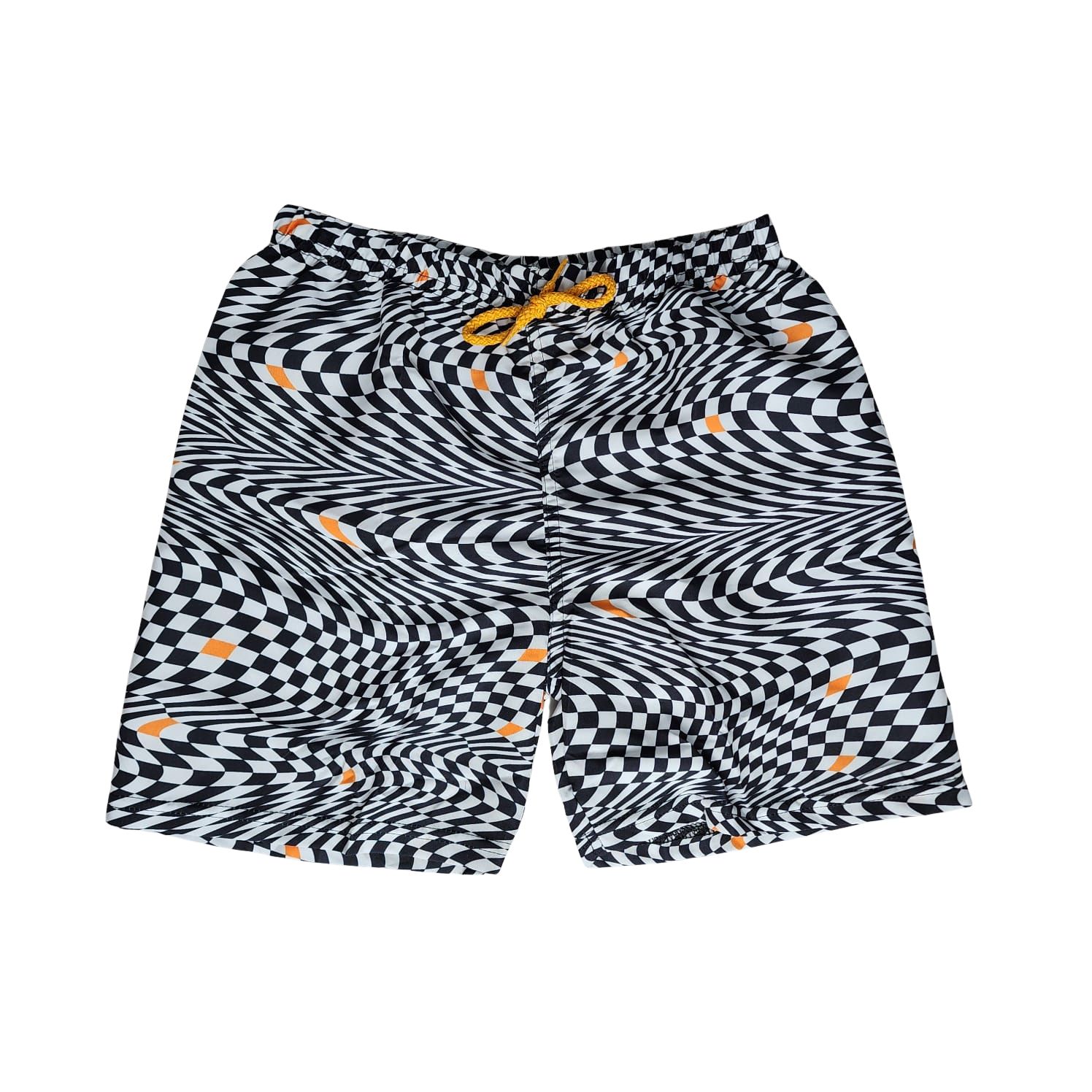 A Bermuda Moda Praia Brandili é a escolha ideal para meninos que gostam de um visual moderno e cheio de personalidade. Com uma estampa vibrante de xadrez preto e branco com um efeito de movimento e detalhes em laranja, ela se destaca na areia ou na piscina.