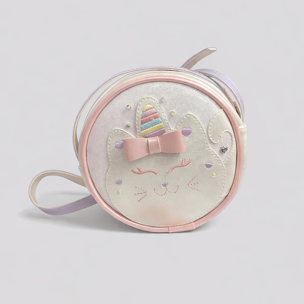Encante as pequenas com a Bolsa Infantil Pampili Unicórnio Gatinho, um acessório delicado, moderno e cheio de charme. Com design redondo, acabamento em glitter e detalhes bordados, ela é perfeita para complementar looks infantis com muito estilo.