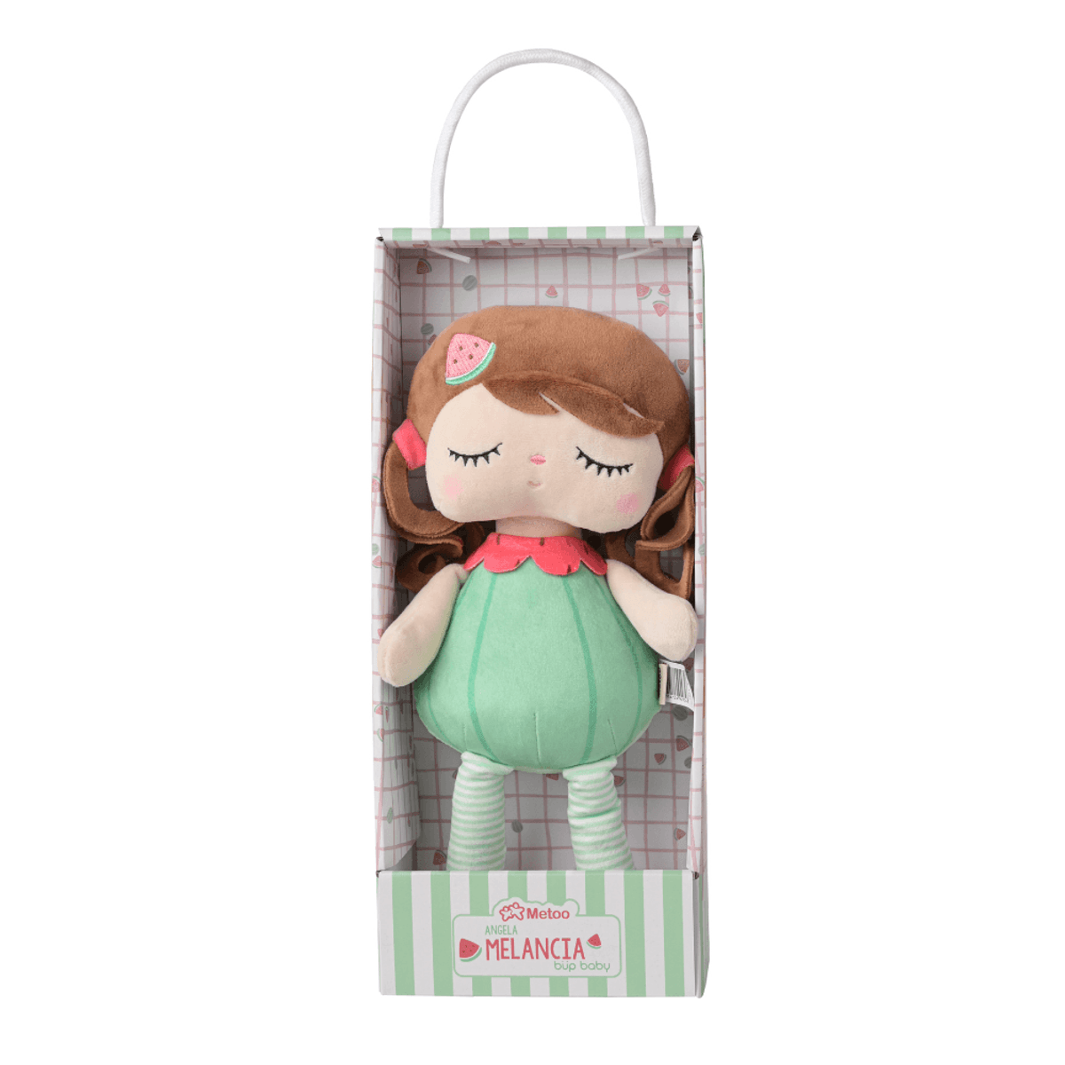 A Angela Frutas Melancia da Metoo é pura fofura e frescor! Com seu visual inspirado na fruta mais refrescante do verão, ela conquista corações com seu corpinho temático, toque aveludado e olhos fechadinhos, que transmitem calma e ternura. Ideal para acompanhar os pequenos desde o nascimento, essa bonequinha é perfeita para decorar, colecionar, presentear ou levar para todos os cantos nas brincadeiras mais doces.