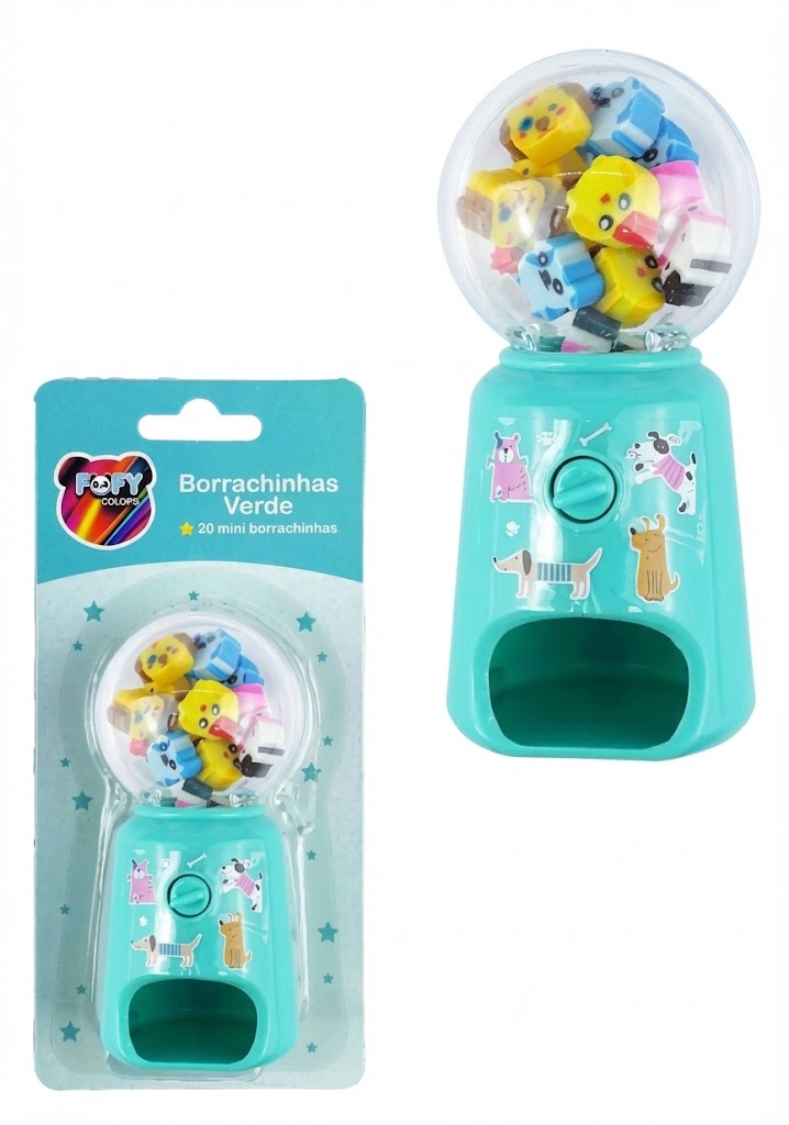 Modelo Verde (Tema Pets): Perfeito para quem ama animais! A máquina em tom verde turquesa apresenta estampas de cachorrinhos simpáticos e ossinhos. O domo contém 20 mini borrachas em formatos divertidos de carinhas de animais coloridos, como patinhos, sapinhos e cachorrinhos.