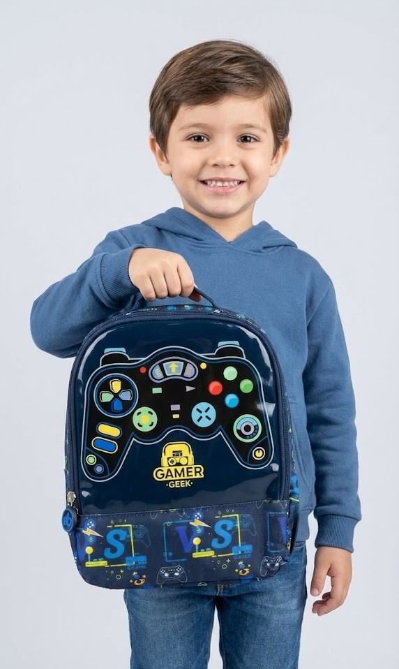A Lancheira Gamer Fofy é ideal para crianças que amam o universo dos jogos. Com estampa moderna de controle de videogame e cores vibrantes, ela une estilo, praticidade e funcionalidade para o dia a dia escolar.