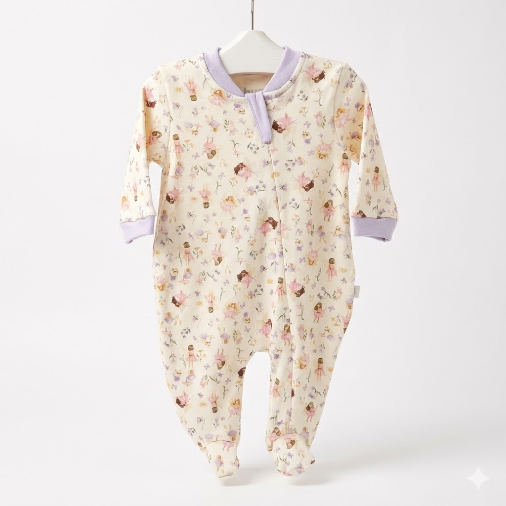 Confeccionado em malha de alta qualidade (toque macio e respirável), o macacão oferece um abraço suave na pele delicada do bebê, garantindo liberdade de movimentos para brincar e um sono tranquilo durante a noite. A estampa é um verdadeiro sonho: um fundo creme delicado adornado com ilustrações aquareladas de fadinhas bailarinas, cogumelos mágicos e pequenas flores silvestres.