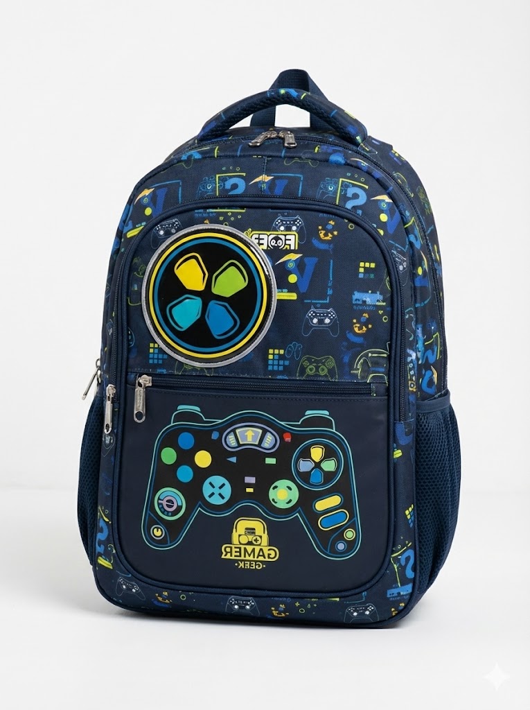 Prepare-se para a volta às aulas ou para a próxima aventura com a Mochila Gamer Geek. Confeccionada em material resistente na cor azul marinho, esta mochila destaca-se pela sua vibrante estampa frontal de controle de videogame e detalhes em neon, perfeita para os fãs de jogos eletrônicos.