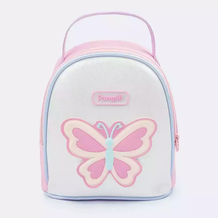 O design ganha vida com o detalhe frontal exclusivo: uma linda borboleta em relevo com sobreposições em tons pastéis de rosa e azul, acompanhada da logo emborrachada da marca que atesta a qualidade do produto. Pensando no conforto absoluto das pequenas, a mochila conta com alças de costas feitas em gorgurão rosa super macio e resistente, que permitem ajuste fácil para diferentes alturas, além de uma prática alça de mão lilás para maior versatilidade.