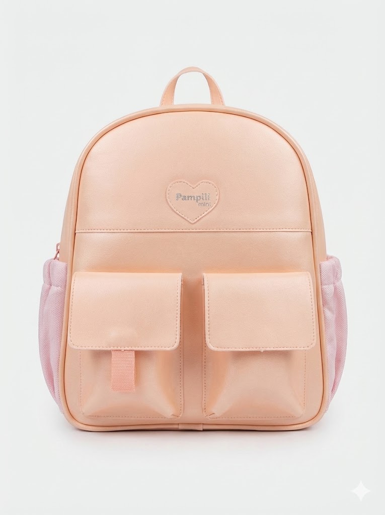 Encante-se com esta deslumbrante mochila infantil da linha "Pampili Mini", um acessório que define o equilíbrio perfeito entre delicadeza, estilo moderno e praticidade para o dia a dia das pequenas. O primeiro detalhe que cativa o olhar é o seu acabamento metalizado premium em um tom suave e sofisticado de rosa pêssego (semelhante ao rose gold). Este material não apenas confere um brilho perolado charmoso e contemporâneo, mas também sugere durabilidade e facilidade de limpeza, características essenciais para produtos infantis.