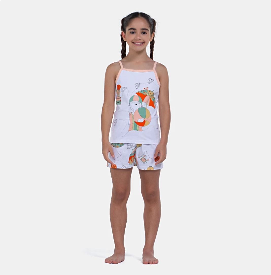 Pijama de alça com estampa local, confeccionada em tecido cotton (96% algodão e 4% elastano) e short com estampa corrida em tecido meia-malha 100% algodão.