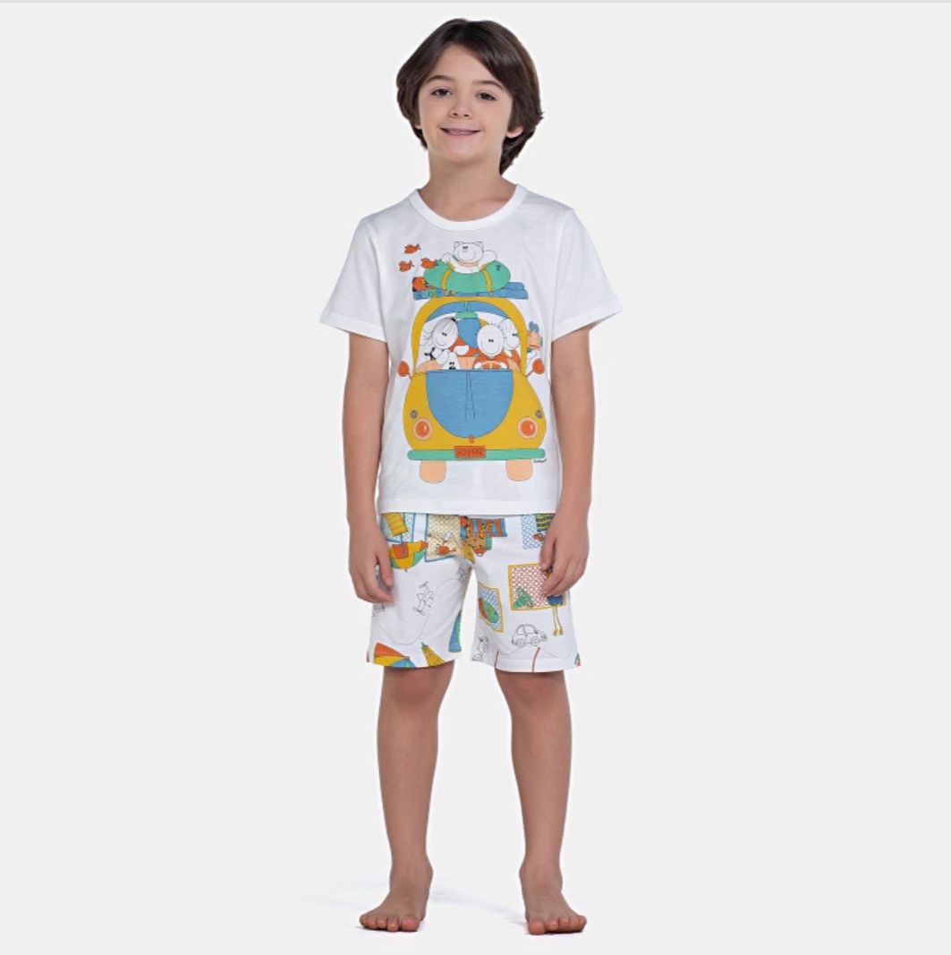 Pijama camiseta com estampa local e bermuda com estampa corrida, confeccionados em tecido meia-malha 100% algodão.