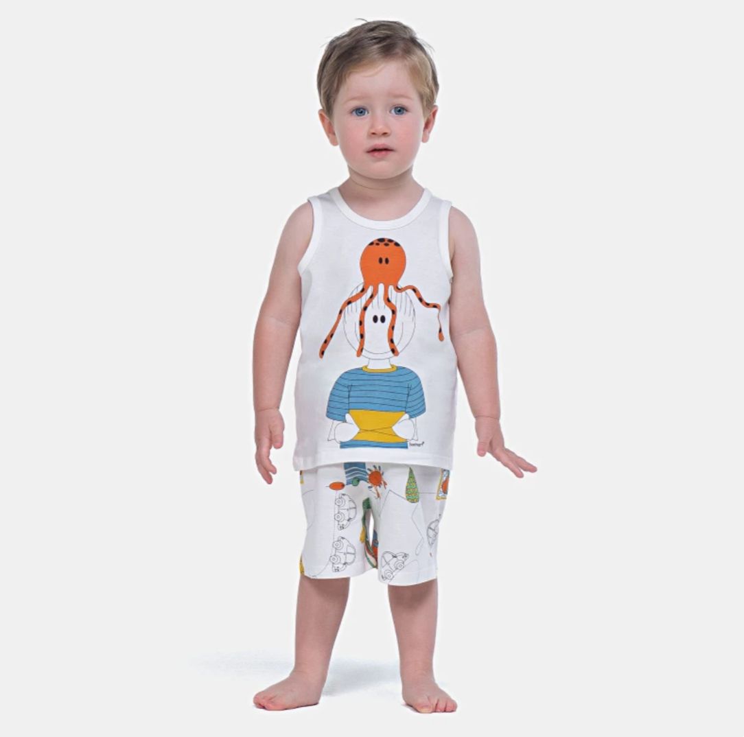 Pijama regata com estampa local e bermuda com estampa corrida, confeccionados em tecido meia-malha 100% algodão.