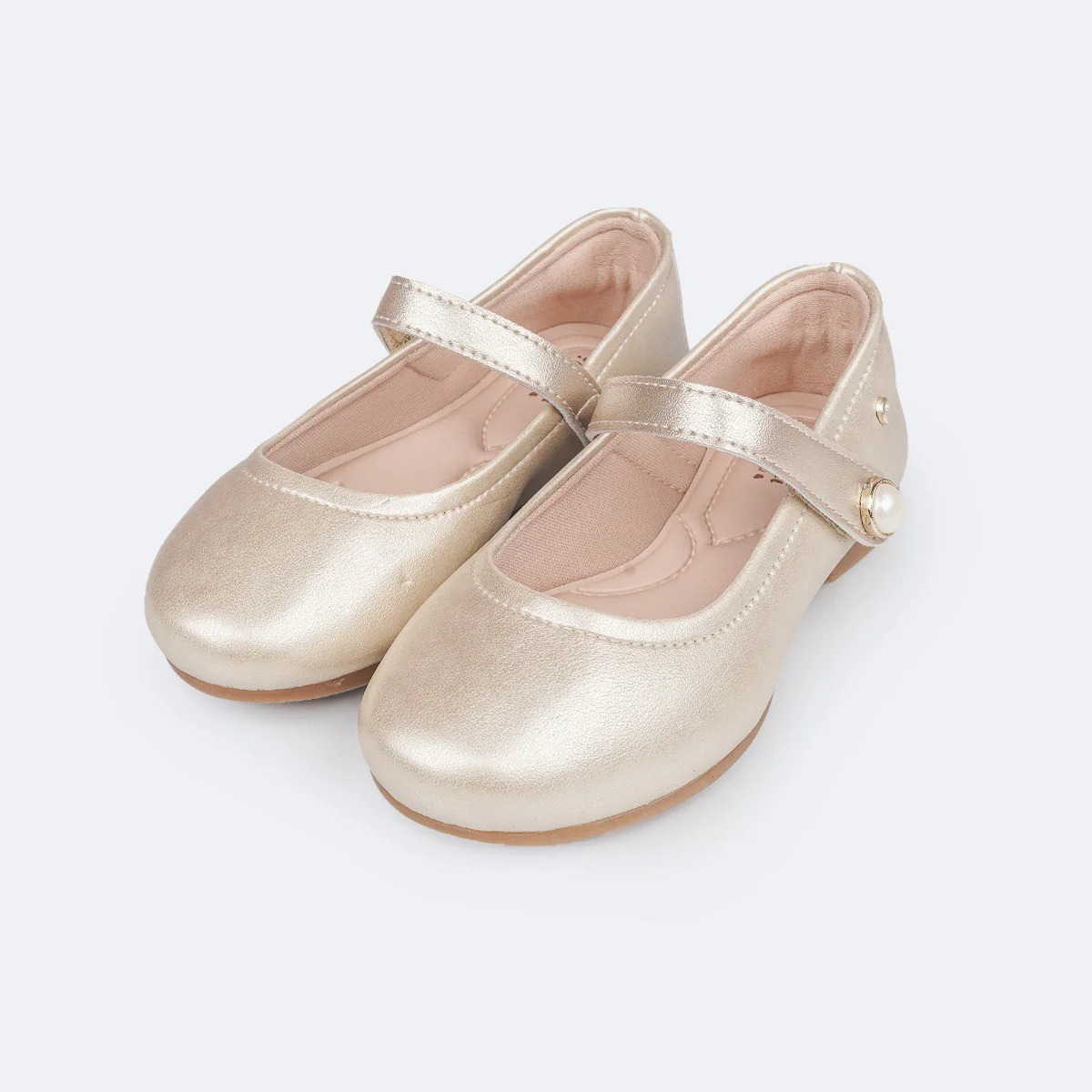 Sapato infantil feminino em sintético dourado com tira superior com fecho em velcro e detalhe de pérola na lateral, clássico e prático para acompanhar a menina em seu dia a dia e festas! Sapato infantil forrado com tecido que auxilia na absorção do suor, com espuma no calcanhar e biqueira em vinil para mais proteção. Sapato feminino com palmilha C'alma, que possui pontos de conforto em lugares estratégicos proporcionando uma sensação de leveza e bem estar aos pezinhos. Sapatilha feminina com solado emborrachado antiderrapante, leve e flexível. Sapatilha infantil com fechamento em fivela sem pino, que facilita o calce para a mamãe!