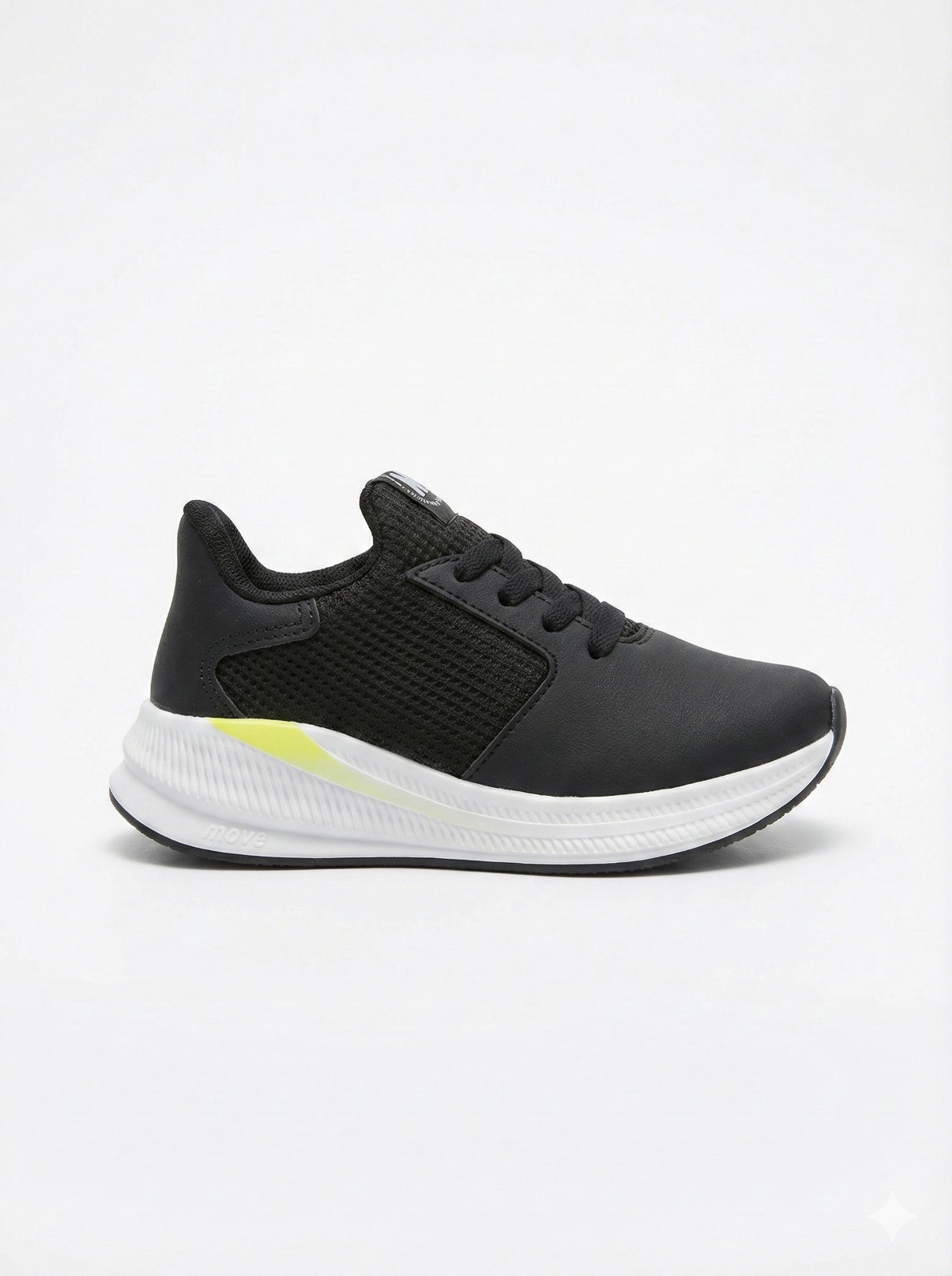 O visual predominantemente preto é versátil e fácil de combinar, enquanto a entressola branca com um vibrante detalhe em verde neon no calcanhar adiciona um toque de personalidade e energia que os pequenos adoram.