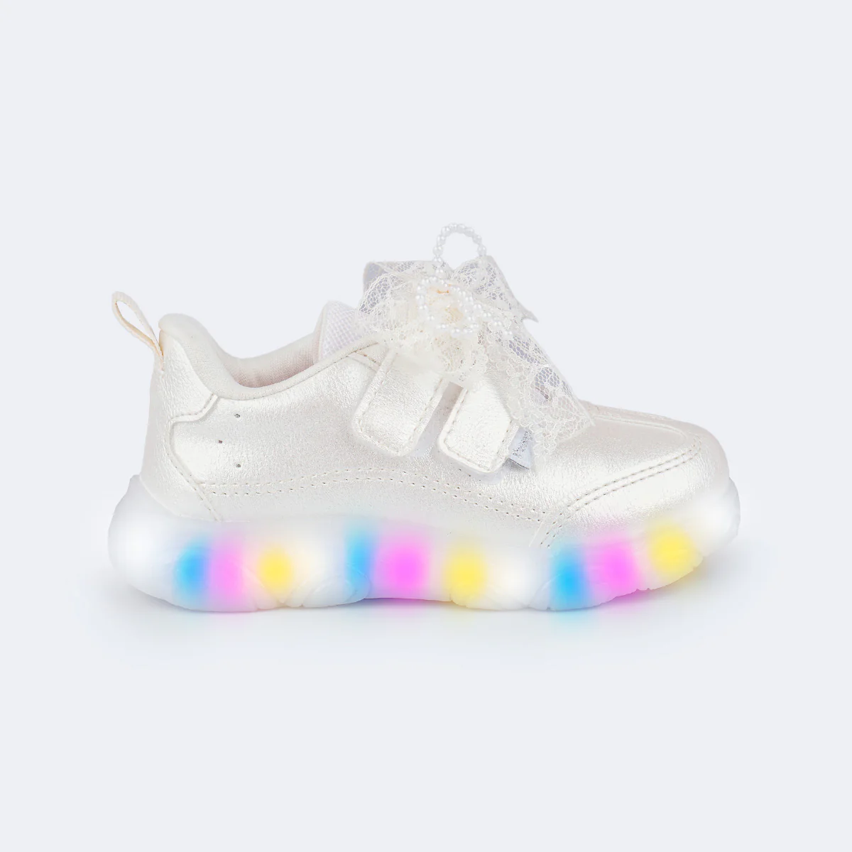 Pensado para acompanhar a rotina da menina com conforto e delicadeza, este tênis branco perolado traz um cabedal estruturado, perfeito para os primeiros passinhos. O laço de renda com mini pérolas — que pode ser removível — permite personalizar o visual, deixando o modelo mais romântico ou mais neutro conforme a ocasião. O fechamento em dupla fita aderente garante calce fácil e autonomia para a menina, enquanto o forro macio e o colarinho comfy envolvem os pezinhos de forma acolhedora durante todo o dia.